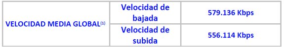 Velocidad media global del servicio móvil de acceso a Internet: Se obtiene ponderando los valores de velocidad media publicados por cada operador con el número total de clientes para cada servicio de acceso a Internet.