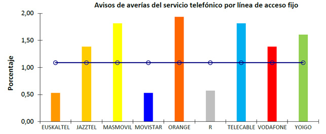 Porcentaje de avisos de avería por línea de acceso fijo del servicio telefónico fijo y servicio de acceso a Internet: Se define como la relación entre los avisos válidos de avería comunicados por los clientes residenciales sobre posibles averías en la red de acceso del operador y el número medio de líneas en servicio. El número medio de líneas en servicio es obtenido a partir de las líneas sobre las que se presta el servicio telefónico o el servicio de acceso a Internet, tanto si éste es el único servicio suministrado, como si sobre la línea se proporcionan otros servicios. Los avisos de avería contabilizados son los referidos al servicio telefónico fijo o al servicio de acceso a Internet. Su medición se realiza contabilizando todos los avisos válidos de avería recibidos durante el trimestre y el resultado se expresa como un porcentaje. Se mide y publica desagregado para el servicio telefónico fijo y para el servicio de acceso a Internet fijo.