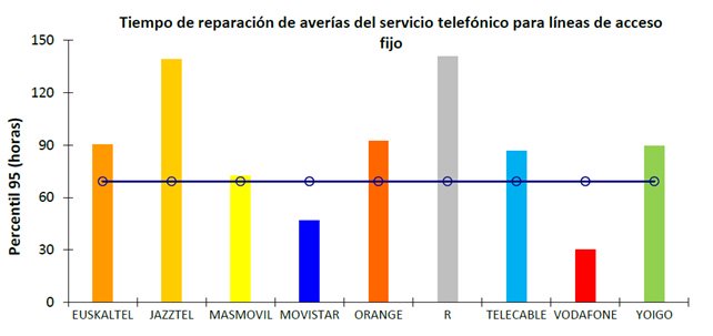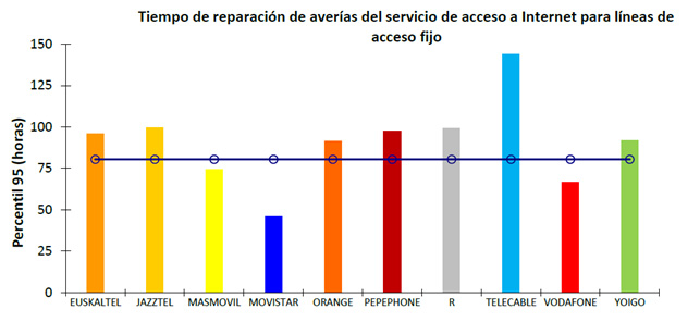 Tiempo de reparación de averías para líneas de acceso fijo del servicio telefónico fijo y servicio de acceso a Internet: Se define como el tiempo transcurrido desde el instante en el que se ha notificado por el cliente un aviso de avería hasta el momento en que el elemento del servicio, o servicios, se ha restablecido a su normal funcionamiento. Se contemplan las siguientes mediciones: