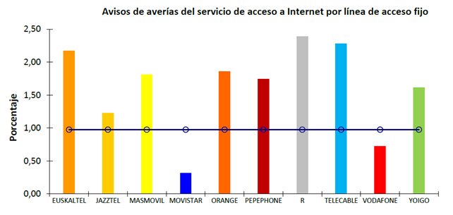 Operador por debajo de la media en más ocasiones: Euskatel, Telecable y Vodafone