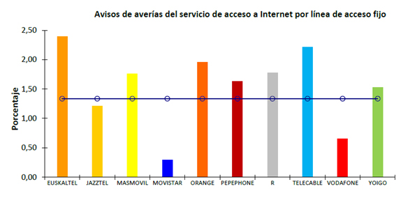 Porcentaje de avisos de avería por línea de acceso fijo del servicio telefónico fijo y servicio de acceso a Internet: Se define como la relación entre los avisos válidos de avería comunicados por los clientes residenciales sobre posibles averías en la red de acceso del operador y el número medio de líneas en servicio. El número medio de líneas en servicio es obtenido a partir de las líneas sobre las que se presta el servicio telefónico o el servicio de acceso a Internet, tanto si éste es el único servicio suministrado, como si sobre la línea se proporcionan otros servicios. Los avisos de avería contabilizados son los referidos al servicio telefónico fijo o al servicio de acceso a Internet. Su medición se realiza contabilizando todos los avisos válidos de avería recibidos durante el trimestre y el resultado se expresa como un porcentaje. Se mide y publica desagregado para el servicio telefónico fijo y para el servicio de acceso a Internet fijo.