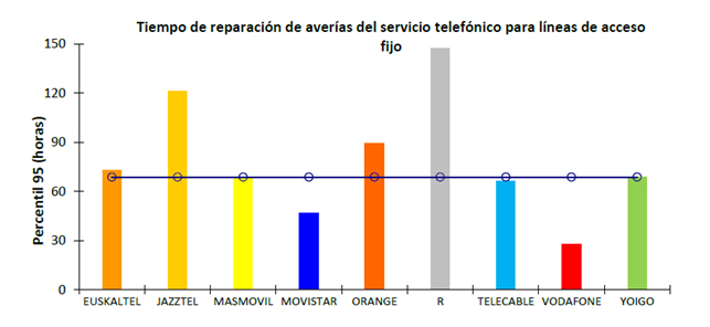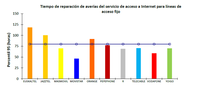 Tiempo de reparación de averías para líneas de acceso fijo del servicio telefónico fijo y servicio de acceso a Internet: Se define como el tiempo transcurrido desde el instante en el que se ha notificado por el cliente un aviso de avería hasta el momento en que el elemento del servicio, o servicios, se ha restablecido a su normal funcionamiento. Se contemplan las siguientes mediciones:
