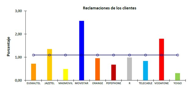 Frecuencia de reclamaciones de los clientes: Se define como la relación entre en total de reclamaciones relativas al servicio telefónico y/o al servicio de acceso a Internet, realizadas por los clientes residenciales, y el número medio de clientes residenciales activos en el trimestre. Su medición se realiza a partir de los datos de todas las reclamaciones presentadas por los clientes residenciales, por teléfono, fax, correo, e-mail, etc. durante el trimestre. A estos efectos se considera como reclamación cualquier expresión de insatisfacción o una observación negativa del cliente referida a los mencionados servicios. No debe confundirse con una petición de información, consulta técnica o aclaración solicitada por el cliente a su operador. No se considerará como reclamación la comunicación de una avería, aunque sí la reclamación de un aviso de avería. Se efectúan mediciones separadas de este parámetro para el servicio fijo y el servicio móvil.
