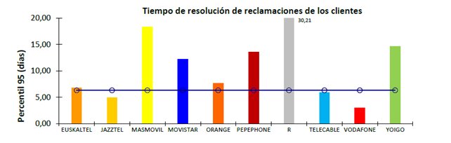 Tiempo de resolución de reclamaciones de los clientes: Se define como el tiempo transcurrido entre la presentación por parte de un cliente residencial de una reclamación relativa al servicio telefónico y/o al servicio de acceso a Internet y la resolución por el operador de dicha reclamación. Su medición se realiza a partir de los datos de todas las reclamaciones resueltas durante el trimestre. Se ordenan de menor a mayor tiempo de resolución y se toma el registro correspondiente al 95 % de todas las reclamaciones. El valor de este registro (percentil 95) es el valor que publica el operador. Se efectúan mediciones separadas de este parámetro para el servicio fijo y el servicio móvil.