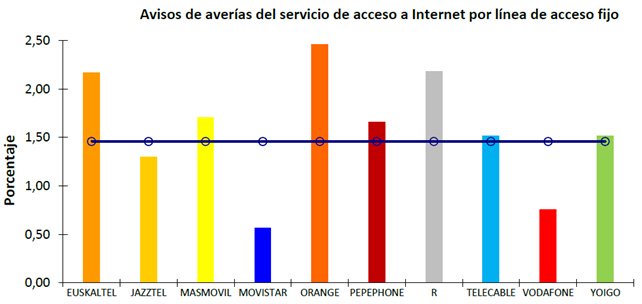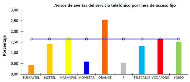 Porcentaje de avisos de avería por línea de acceso fijo del servicio telefónico fijo y servicio de acceso a Internet: Se define como la relación entre los avisos válidos de avería comunicados por los clientes residenciales sobre posibles averías en la red de acceso del operador y el número medio de líneas en servicio. El número medio de líneas en servicio es obtenido a partir de las líneas sobre las que se presta el servicio telefónico o el servicio de acceso a Internet, tanto si éste es el único servicio suministrado, como si sobre la línea se proporcionan otros servicios. Los avisos de avería contabilizados son los referidos al servicio telefónico fijo o al servicio de acceso a Internet. Su medición se realiza contabilizando todos los avisos válidos de avería recibidos durante el trimestre y el resultado se expresa como un porcentaje. Se mide y publica desagregado para el servicio telefónico fijo y para el servicio de acceso a Internet fijo.