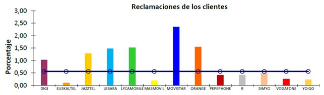 Frecuencia de reclamaciones de los clientes: Se define como la relación entre en total de reclamaciones relativas al servicio telefónico y/o al servicio de acceso a Internet, realizadas por los clientes residenciales, y el número medio de clientes residenciales activos en el trimestre. Su medición se realiza a partir de los datos de todas las reclamaciones presentadas por los clientes residenciales, por teléfono, fax, correo, e-mail, etc. durante el trimestre. A estos efectos se considera como reclamación cualquier expresión de insatisfacción o una observación negativa del cliente referida a los mencionados servicios. No debe confundirse con una petición de información, consulta técnica o aclaración solicitada por el cliente a su operador. No se considerará como reclamación la comunicación de una avería, aunque sí la reclamación de un aviso de avería. Se efectúan mediciones separadas de este parámetro para el servicio fijo y el servicio móvil.