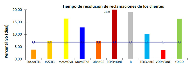 Tiempo de resolución de reclamaciones de los clientes: Se define como el tiempo transcurrido entre la presentación por parte de un cliente residencial de una reclamación relativa al servicio telefónico y/o al servicio de acceso a Internet y la resolución por el operador de dicha reclamación. Su medición se realiza a partir de los datos de todas las reclamaciones resueltas durante el trimestre. Se ordenan de menor a mayor tiempo de resolución y se toma el registro correspondiente al 95 % de todas las reclamaciones. El valor de este registro (percentil 95) es el valor que publica el operador. Se efectúan mediciones separadas de este parámetro para el servicio fijo y el servicio móvil.