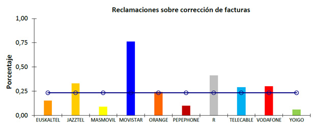 Reclamaciones sobre corrección de facturas: Relación entre las facturas que han sido objeto de reclamación sobre su contenido, realizadas por los clientes residenciales, relativas al servicio telefónico y/o al servicio de acceso a Internet y el número total de facturas emitidas a estos clientes. Su medida se realiza contabilizando el número de facturas reclamadas por algún aspecto relativo a su contenido durante el trimestre y se expresa en porcentaje. Se efectúan mediciones separadas de este parámetro para el servicio fijo y el servicio móvil.