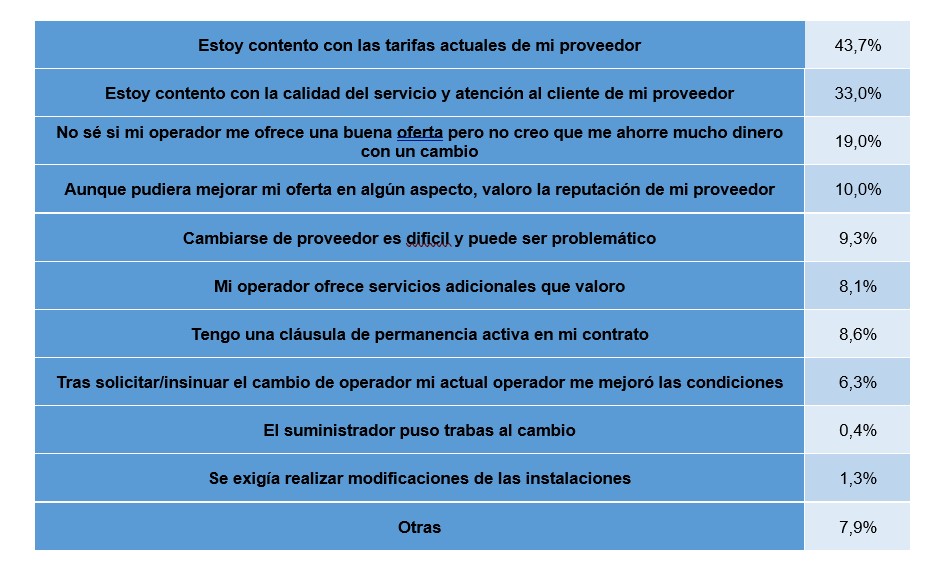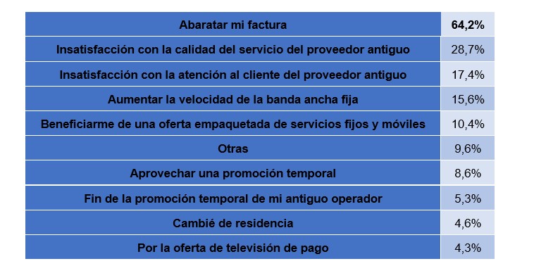 No se registran novedades en las razones detrás de este churn: abaratar la factura explica un 64% de los cambios (en 2020 era un 68%). El siguiente argumento, ya muy lejos, la insatisfacción, con un 45% acumulado (en 2020 suponía un 49% de las motivaciones).
