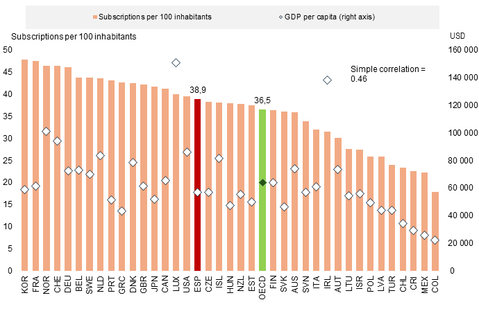 Y acabamos este resumen gráfico con un área de mejora, que se representa a la perfección en el siguiente gráfico: España se ubica algo retrasada en el número de clientes por cada 100 habitantes si se relaciona con el PIB per cápita. España, con su capacidad económica, debería tener muchas más suscripciones:
