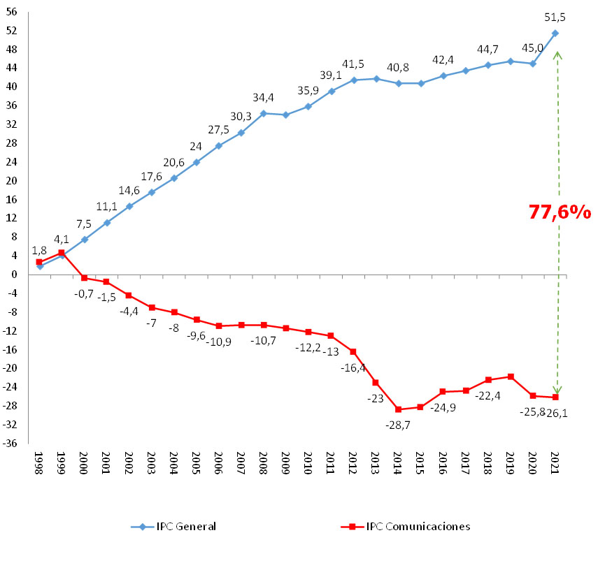 Pero nadie habla del único sector que ha sido deflacionario: el de las Comunicaciones. La siguiente tabla no puede ser más significativa: sólo en nuestro sector retrocedieron los precios, hasta tres décimas; casi siete puntos de diferencia con el índice general y muy por debajo de otros servicios como el Ocio o el Vestido.