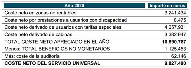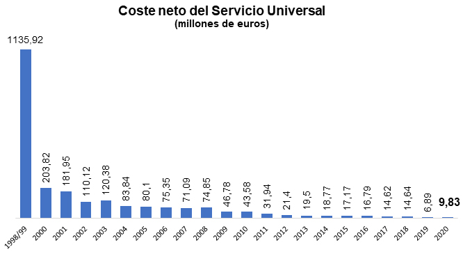 Estos 9,8 millones de euros es una cifra superior a la del ejercicio precedente, que no alcanzó los 7 millones. Esto se debe, principalmente, a que en 2019 se excluyó del cálculo final el apartado de cabinas, como consecuencia de una demanda judicial de Telefónica. Por ello, la mejor comparativa sería la referenciada a 2018, en donde se comprueba la clara tendencia a la baja del coste neto: