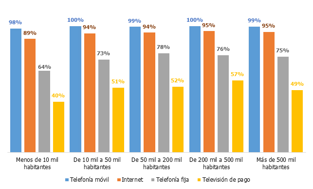 Otro de los aspectos más interesante de estas estadísticas son los referidos a la brecha digital geográfica y, más en concreto, a la adopción de los diferentes servicios de telecomunicaciones por el tipo de población. En esta última publicación se observa cómo la TV de pago se va introduciendo en las poblaciones más pequeñas, alcanzando a un significativo 40% de hogares. En cualquier caso, la línea de negocio más presente es la conexión a Internet, que no desciende del 89% en ningún supuesto:
