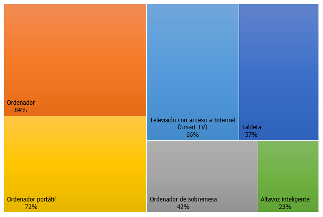 Finalmente, damos cuenta del equipamiento digital que se registra en los hogares españoles, con un dato destacado: el dos de cada tres ya disponen de una Smart TV y una de cada cuatro, de un altavoz inteligente: