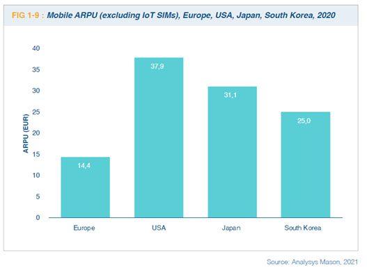 El informe resume la situación de la competencia ligada a precios, con unos datos que no pueden ser más contundentes: el ARPU de las conexiones fijas europeo es más de la mitad que del EEUU (21,5€ vs. 49,1€) y un 35% menos que el de Japón (29,2€). En conexiones móviles la distancia aun es mayor y nos coloca a la cola del mundo en ingresos por telefonía móvil: