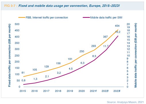 Y a una a pesar de todo ello, las telecos europeas no tienen otra opción que seguir invirtiendo masivamente, puesto que los requerimientos de conexión de los clientes no hacen más que crecer y crecer: