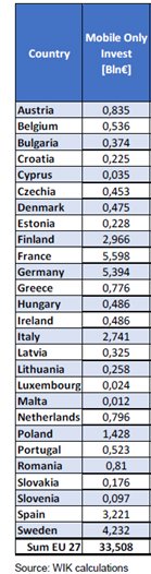 Las conclusiones del informe, elaborado por la consultora WIK, afirman que, para que los ciudadanos y las empresas europeos se beneficien de todas las capacidades que pueden ofrecer las redes móviles 5G (el denominado “5G completo”), se necesitarían unas inversiones de alrededor de 33.500 millones de euros, que se dedicarían a las instalar estaciones base necesarias para proporcionar el ancho de banda requerido.