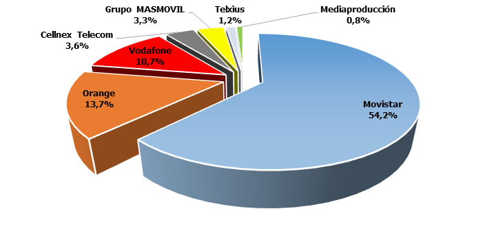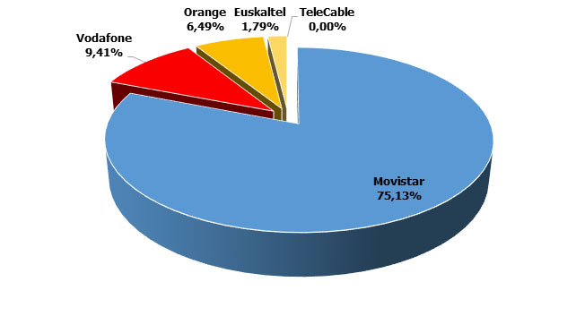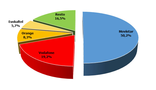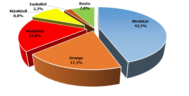 En cuanto a cuotas, Movistar pierde dos puntos, Vodafone recupera terreno y vuelve a superar el 10% y MásMóvil supera el 3%: