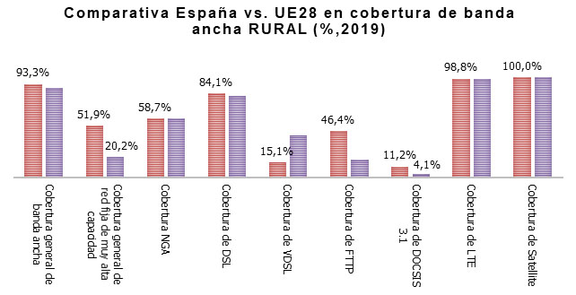 El Broadband Coverage in Europe1https://ec.europa.eu/digital-single-market/en/news/broadband-coverage-europe-2019, correspondiente al año 2019, nos presenta un escenario en donde nuestro país destaca por sus redes de fibra óptica2La Comisión Europea usa el término FTTP que, aunque resulta semejante al FTTH desplegado en España, es inferior en cuanto a alcance físico; https://es.wikipedia.org/wiki/FTTP, situándose en el segundo puesto de toda la Unión y 47 puntos porcentuales por encima de la media europea.