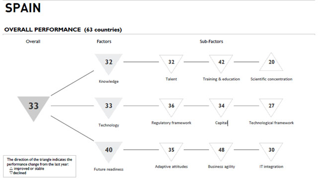 En IMD 2020, en su trigésima edición, sitúa a España en un deshonroso y preocupante 33 puesto, lejísimos de las principales economías del mundo y muy por debajo de lo que nos correspondería por PIB y capacidad económica (13 del mundo por PIB nominal2https://es.wikipedia.org/wiki/Anexo:Pa%C3%ADses_por_PIB_(nominal)).