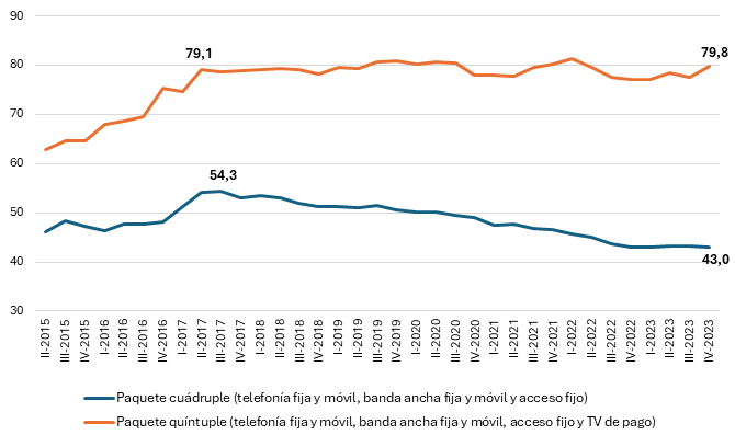 Un servicio de telecomunicaciones empaquetado con telefonía fija y móvil, banda ancha fija y móvil y acceso fijo cuesta hoy 9 euros menos que en 2017 (casi un 21% menos, cuando el IPC aumentó un 19,5%, lo que representa un diferencial de un 40%). En cuanto a los paquetes de cinco servicios, el precio se mantiene prácticamente igual en los últimos seis años, a pesar de que el IPC ha aumentado más de veinte por cien.