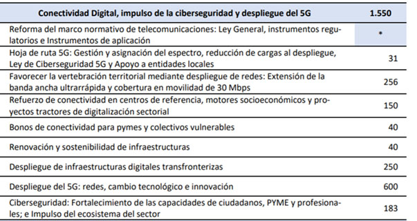 Destaca especialmente la partida dedicada al 5G, con 600 millones. A esta cantidad se le sumarán otros 570 en 2023, teniendo en cuenta que en 2021 ya se asignaron otros 235. En consecuencia, el plan de ayudas al despliegue de 5G alcanzará los 1.405 millones de euros. Con este montante se espera habilitar más de 14.500 nuevos emplazamientos5https://cincodias.elpais.com/cincodias/2021/10/14/companias/1634224862_060840.html.