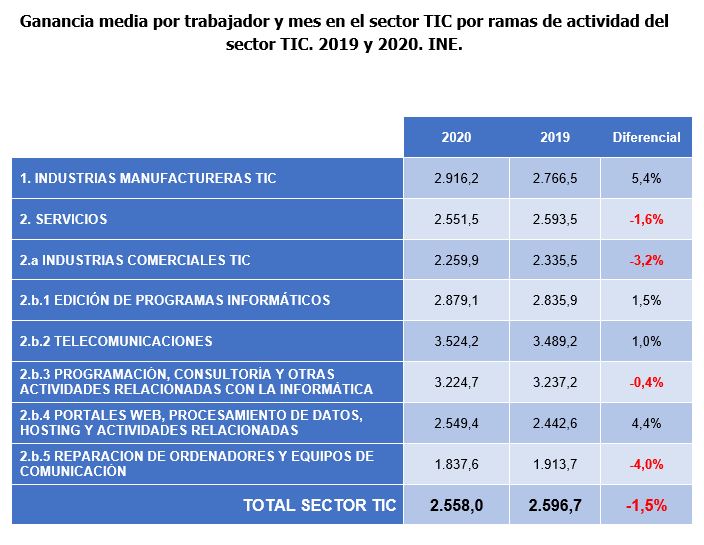De esta forma, la Unión General de Trabajadoras y Trabajadores denuncia que, a pesar de que se registra un leve incremento del empleo total, los salarios han bajado, de media, un 1,5% en este sector. Si bien existen grandes diferencias por cada una de las ramas, no se puede negar la realidad que confirman los datos: existe una tendencia continuada a la precarización en el sector, confirmando así las conclusiones del estudio de UGT sobre empleo tecnológico en España, cada vez peor remunerado, con peores condiciones laborales y con elevadísimo paro.