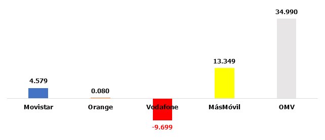 Las pérdidas de enero se reflejan con toda su contundencia en Vodafone, que pierde ya más de un 3% interanual. Le sigue Orange (-1%) y Movistar, que casi se comporta de forma plana. Las OMV, imparables: