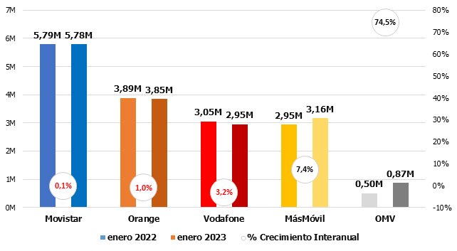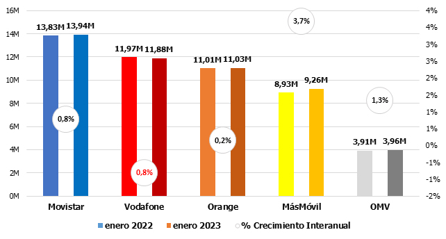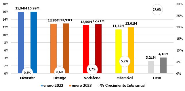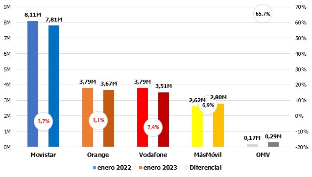 El nuevo año comienza con dos históricos en tendencias contrapuestas: Movistar confirma el buen fin de 2022 y resurge con fuerza, ganando clientes en todas las líneas de negocio (salvo la telefonía fija); justo al contrario, Vodafone ahonda en su debilidad, saldando números negativos en absolutamente todos los negocios. Mientras esto acontece, las OMV vuelven a liderar las tres principales listas: BAM, BAF y telefonía móvil vocal.