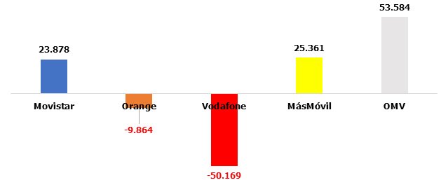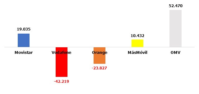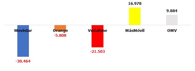 La tendencia positiva de Vodafone se invierte también en este segmento. También MásMóvil cede la delantera a las OMV. Orange repite en negativo y Movistar en positiva, con dígitos casi calcados a los de finales de 2022: