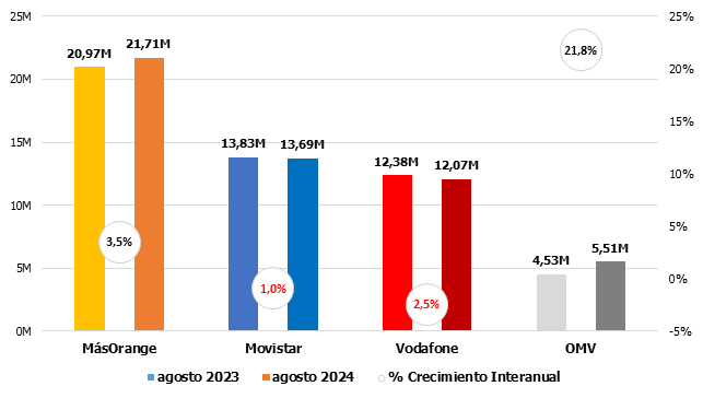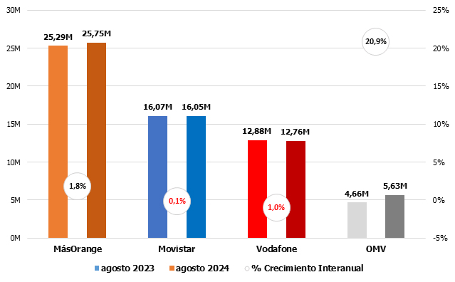 Cuarto mes consecutivo con dificultades para MásOrange. Vodafone mejora su rendimiento en su remontada de verano y las OMV son, simple y llanamente, inalcanzables para sus rivales.