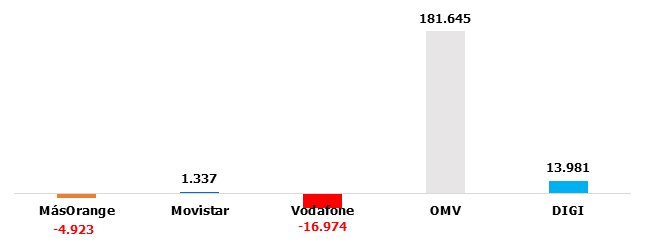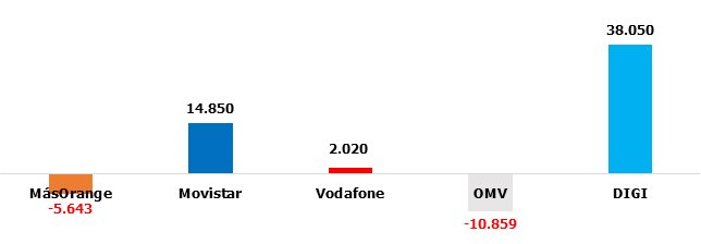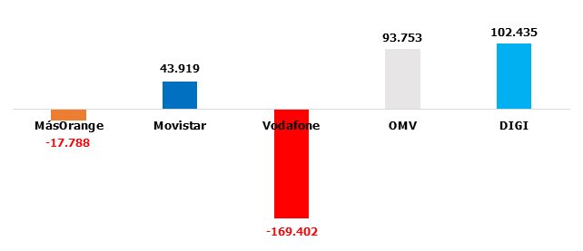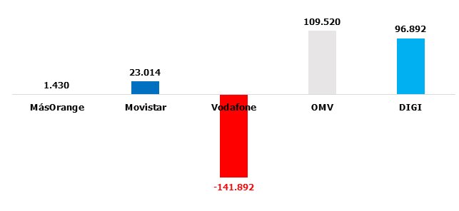 Como ya adelantábamos en el titular, más allá del domino de DIGI -que arrasa hasta con las OMV- , dos operadoras sobresalen en las estadísticas. Por el lado más positivo, Movistar, que reafirma su ritmo de crecimiento de meses anteriores. Por el extremo negativo, MásOrange, que no es capaz de frenar las pérdidas.