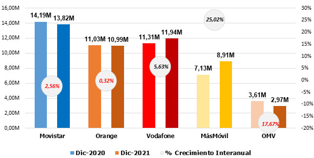 Cuotas de mercado: la foto final de 2021 marca la pérdida del 30% de Movistar y el afianzamiento de cuatro operadoras alrededor del 20%, con una MásMóvil dispuesta a comerse a Orange en 2022.