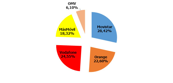 Necesariamente, las coutas de mercado tampoco presentan especiales variaciones, acentuándose la diferencia entre Orange y Vodafone y el asomo de las OMV al 3%: