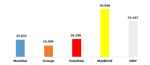 En cuanto a las cuotas de mercado, aquí si que MásMóvil acaba por encima del 20%, mientras que el empate técnico entre naranjas y rojos es la tónica: