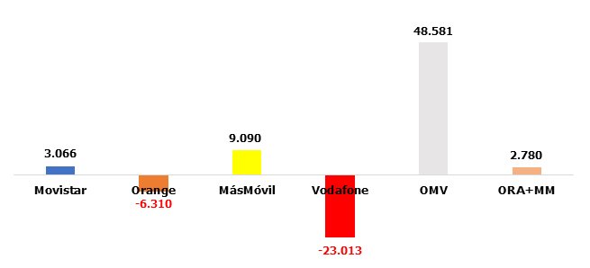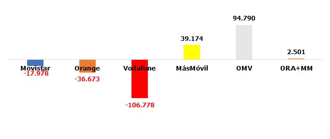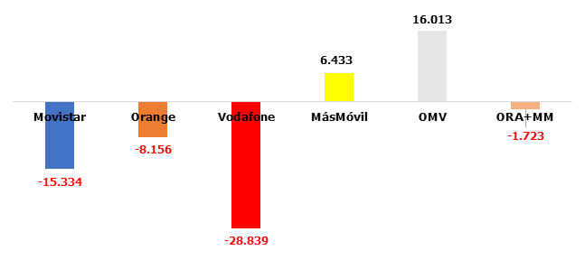 Tres operadoras en negativo, con MásMóvil lider absoluta en esta categoría.