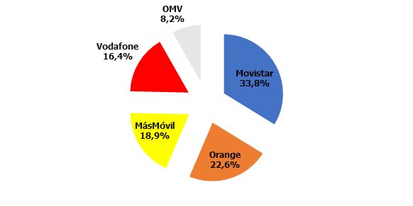 Cuotas de mercado: La nueva Orange+MásMóvil acapara el 41,6% de la cuota de mercado, ante una Movistar que da por perdido el 34%. Las OMV ya son ostenta la mitad de cuota de Vodafone: