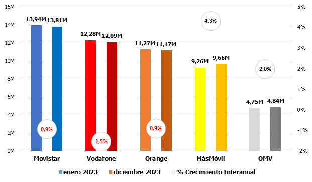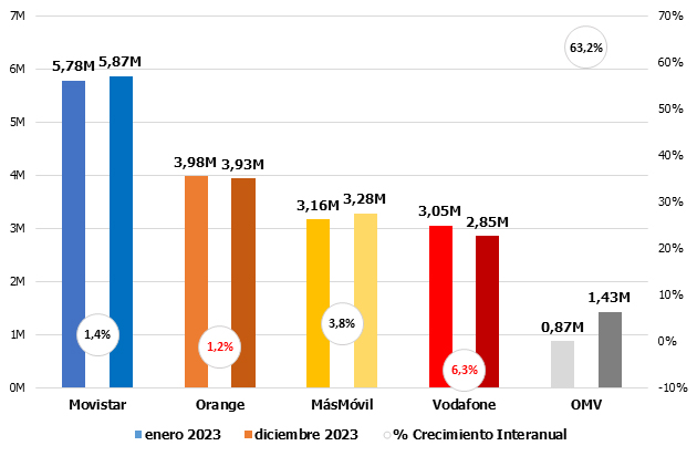 Orange y Vodafone repiten, como en noviembre y diciembre, en negativo. Movistar continúa con su ganancia neta positiva, escasa, pero positiva al fin y al cabo. Las ganancia de MásMóvil consigue que la nueva entidad fusionada se coloque en positivo. Las OMV, intratables: