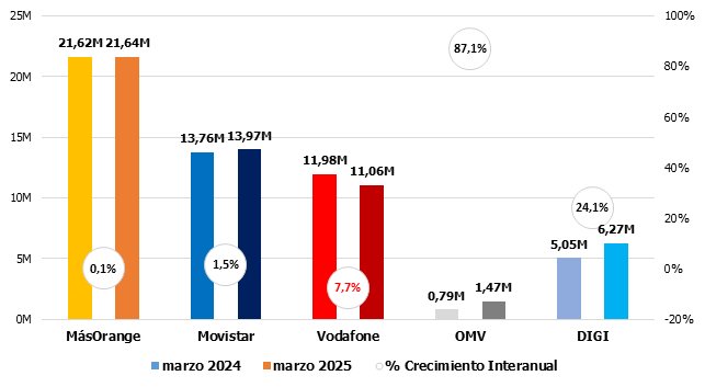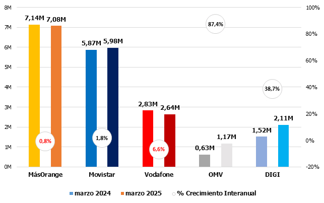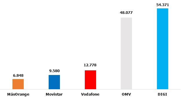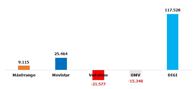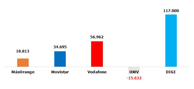 Dura competencia entre DIGI y las OMV, ambas rondando las 50.000 altas netas. Aunque quizás lo más destacable sea Vodafone, que bate a Movistar y MásOrange de forma clara.