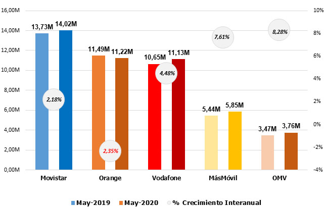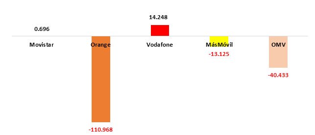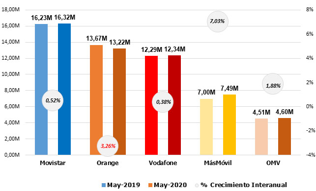 La acumulación de malos resultados coloca a Orange un mal dato interanual, que aprovecha sobre todo Vodafone. Las OMV, a pesar de estos dos malos meses, siguen creciendo a razón de un 8%: