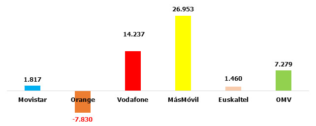 Orange copia el mes anterior, acumulando más de 200.000 bajas. Las OMV, muy dependientes del prepago se dejan 40.000: