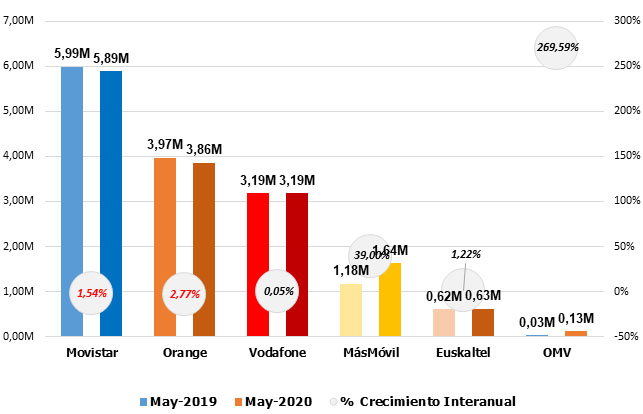 Movistar y MásMóvil sufren pérdidas moderadas y las OMV sufren lo suyo: -40.000 en mayo y -82.000 en abril: