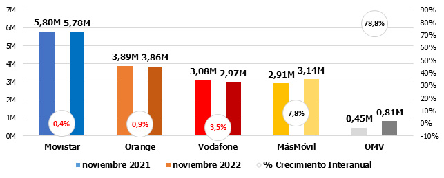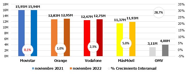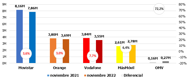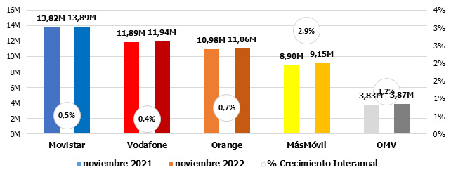 Tambien buen mes para Movistar, que incluso mejora a octubre. Eso sí, no alcanza a ganar a las OMV como en la BAM. MásMóvil se muestra cada vez más débil y Vodafone y Orange no pasan por su mejor momento: