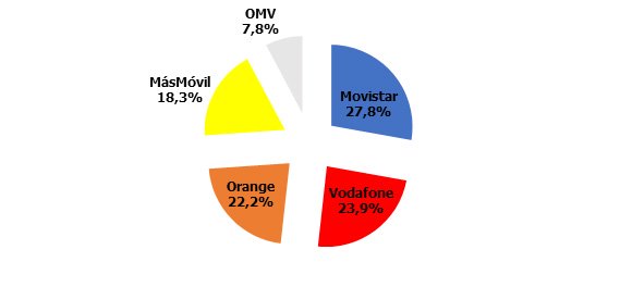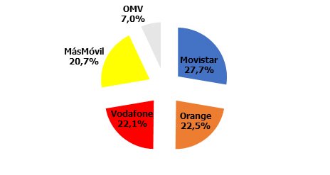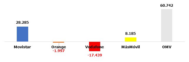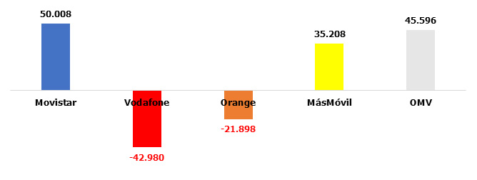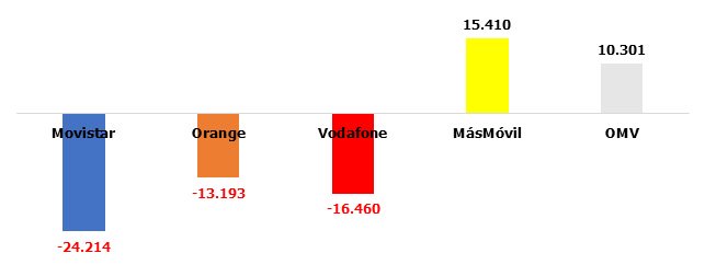 Dominio total y absoluto de las OMV, que casi doblan a su perseguidor amarillo. Movistar salva el mes con una tibia mejora, mientras que Orange y Vodafone empatan en negativo, con casi 6.500 bajas netas: