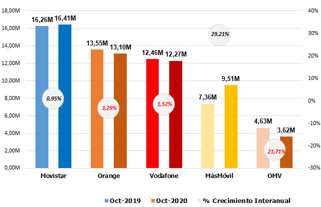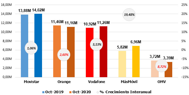 Movistar mejora su tendencia interanual (octubre de 2019 no fue un gran mes) y MásMóvil la empeora (ha reducido a la mitad sus ganancias). Orange no levanta cabeza y Vodafone sigue en negativo: