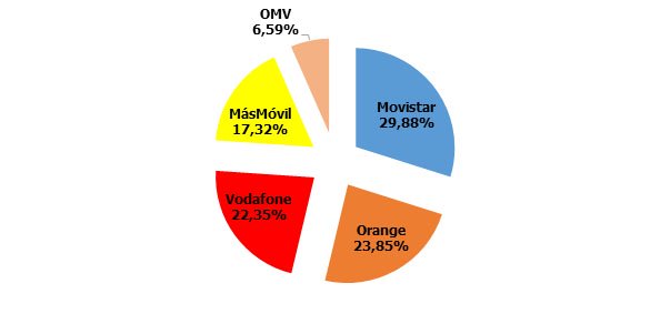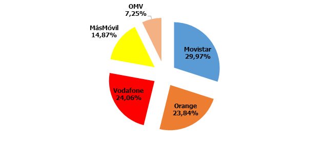 Muchas cosas que decir en el terreno de las coutas de mercado: la falla de Movistar hace que pierda el 30%; MásMóvil ya apunta al 15% y Vodafone supera a Orange con claro margen: