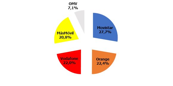 Cuotas de mercado: de nuevo otro empate entre Vodafone y Orange, aunque en este caso las OMV todavía ostentan una porción mínima: