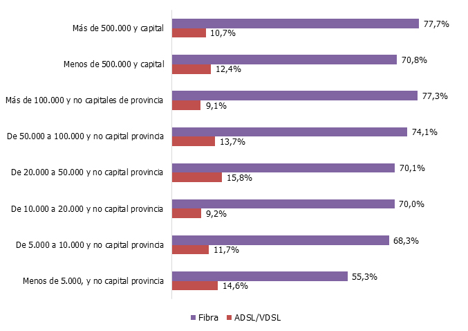 Tipos de banda ancha fija según población del municipio (porcentaje de hogares)