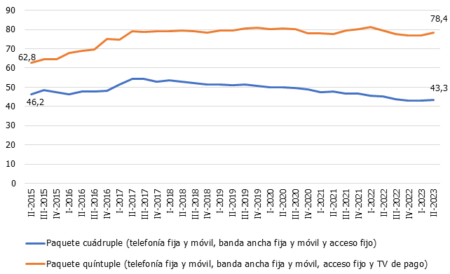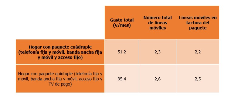 Gastos medios por hogar en los paquetes y servicios de telecomunicaciones más contratados (euros al mes)