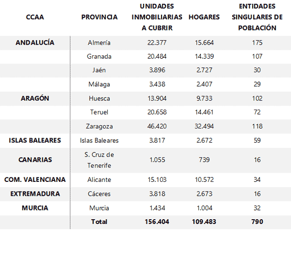 La última convocatoria, publicada a principios de marzo, ha movilizado 37 millones de euros para doces provincias (Almería, Granada, Jaén, Málaga, Huesca, Teruel, Zaragoza, Islas Baleares, Santa Cruz de Tenerife, Alicante, Cáceres y Murcia) que no recibieron propuestas validas que cumplieran los requisitos mínimos en la convocatoria 20205https://amp.europapress.es/economia/noticia-gobierno-concede-mas-36-millones-ayudas-extension-banda-ancha-77-telefonica-20210304120511.html. Con esta inversión se conectarán por fibra a 156.404 unidades inmobiliarias (viviendas y locales comerciales) de 790 poblaciones, con el reparto que se aprecia en la siguiente tabla: